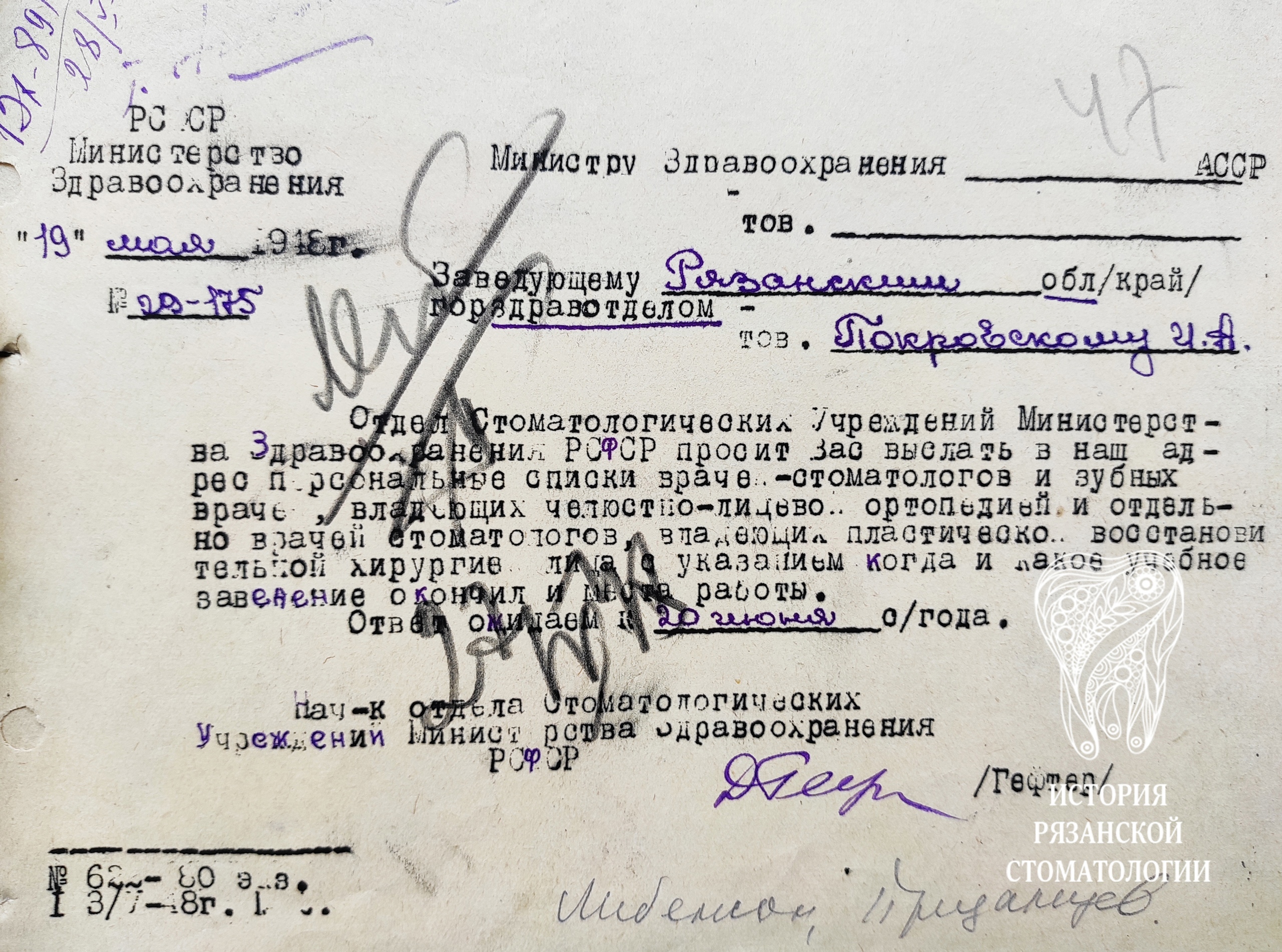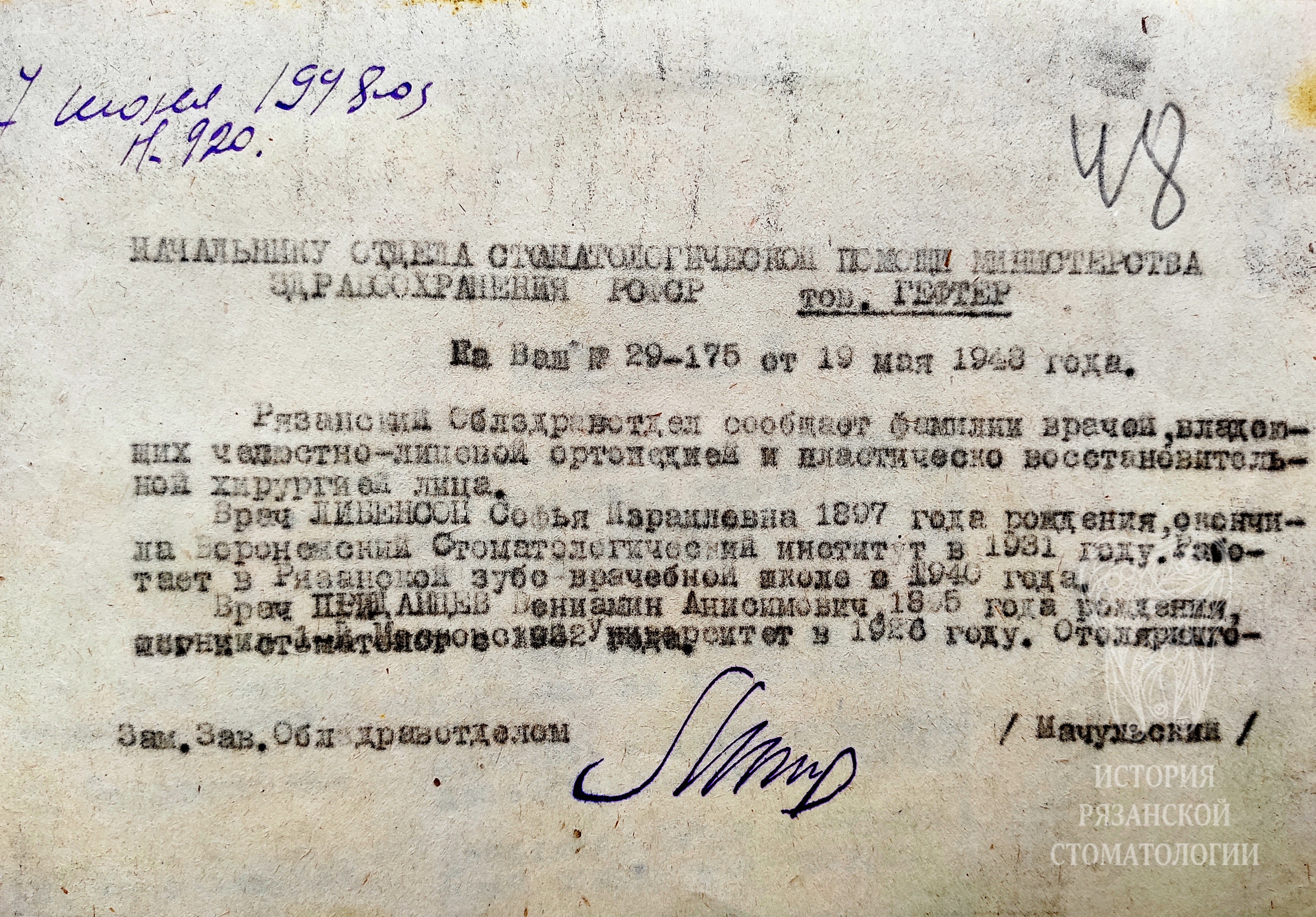 Это были: преподаватель Рязанской зубоврачебной школы Софья Израилевна Либенсон и врач-оториноларинголог Областной больницы имени Семашко Вениамин Анисимович Приданцев. Согласно письму Рязанского облздрава от 10 мая 1948 года, эти врачи владели «челюстно-лицевой ортопедией и пластической восстановительной хирургией лица».