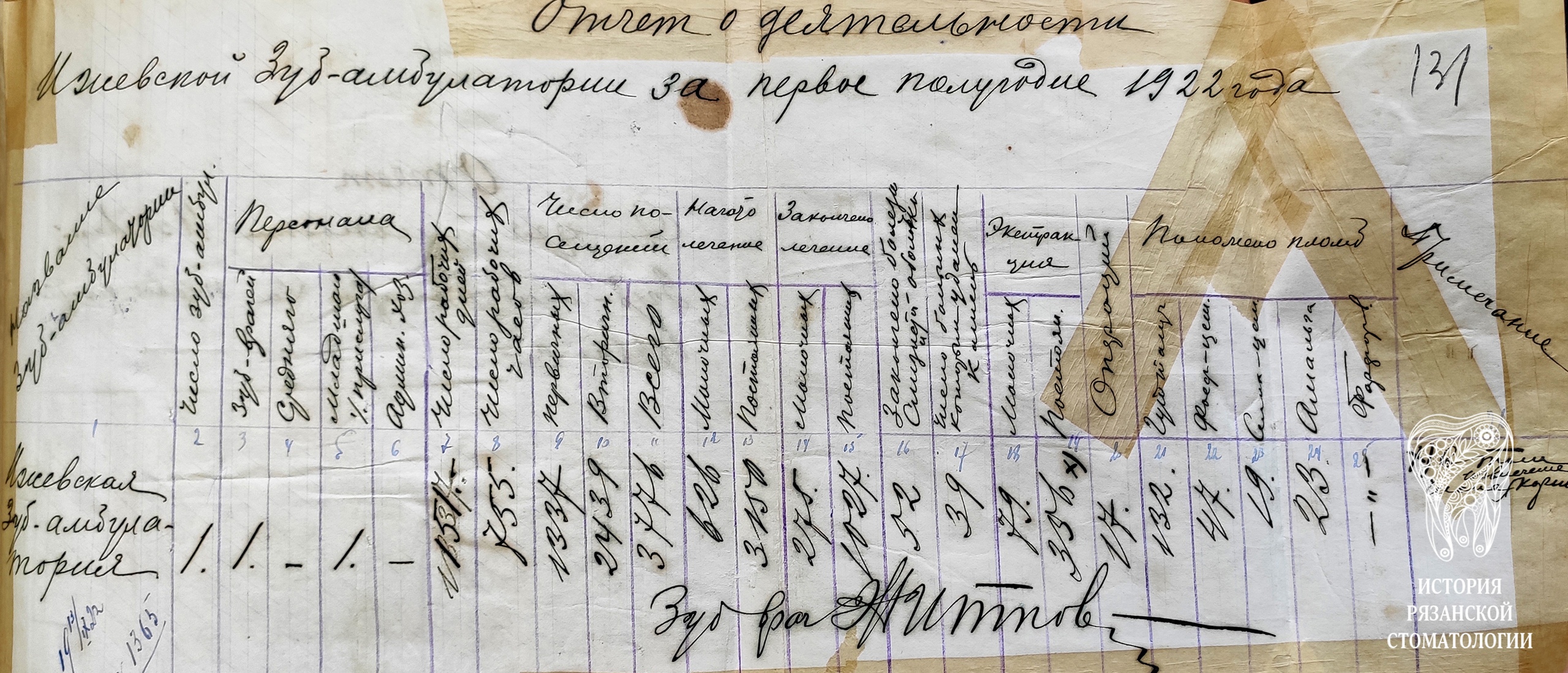1922 год, отчёт о приёме пациентов в Ижевской зубоврачебной амбулаторией, подписанный Петром Житковым.